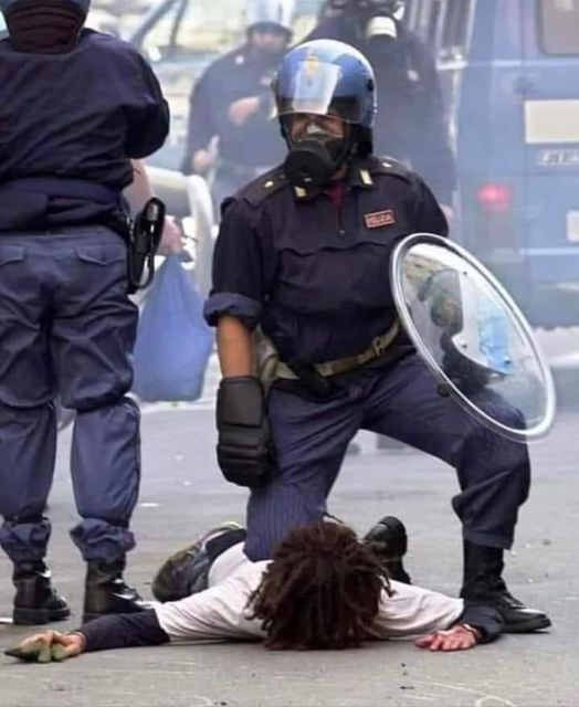 Quest’altra immagine è stata oggetto di una intenso lancio d’insulti virtuali, con condanna senza appello per il poliziotto colto in flagrante alla manifestazione di Pisa. E’ un vero peccato che questo agente sia probabilmente già in pensione. La foto si riferisce ai fatti del 2001, G8 di Genova. E’ grave il gesto che compie l’agente, lo era 23 anni fa, lo sarebbe adesso. Ma non era a Pisa, a febbraio 2024.