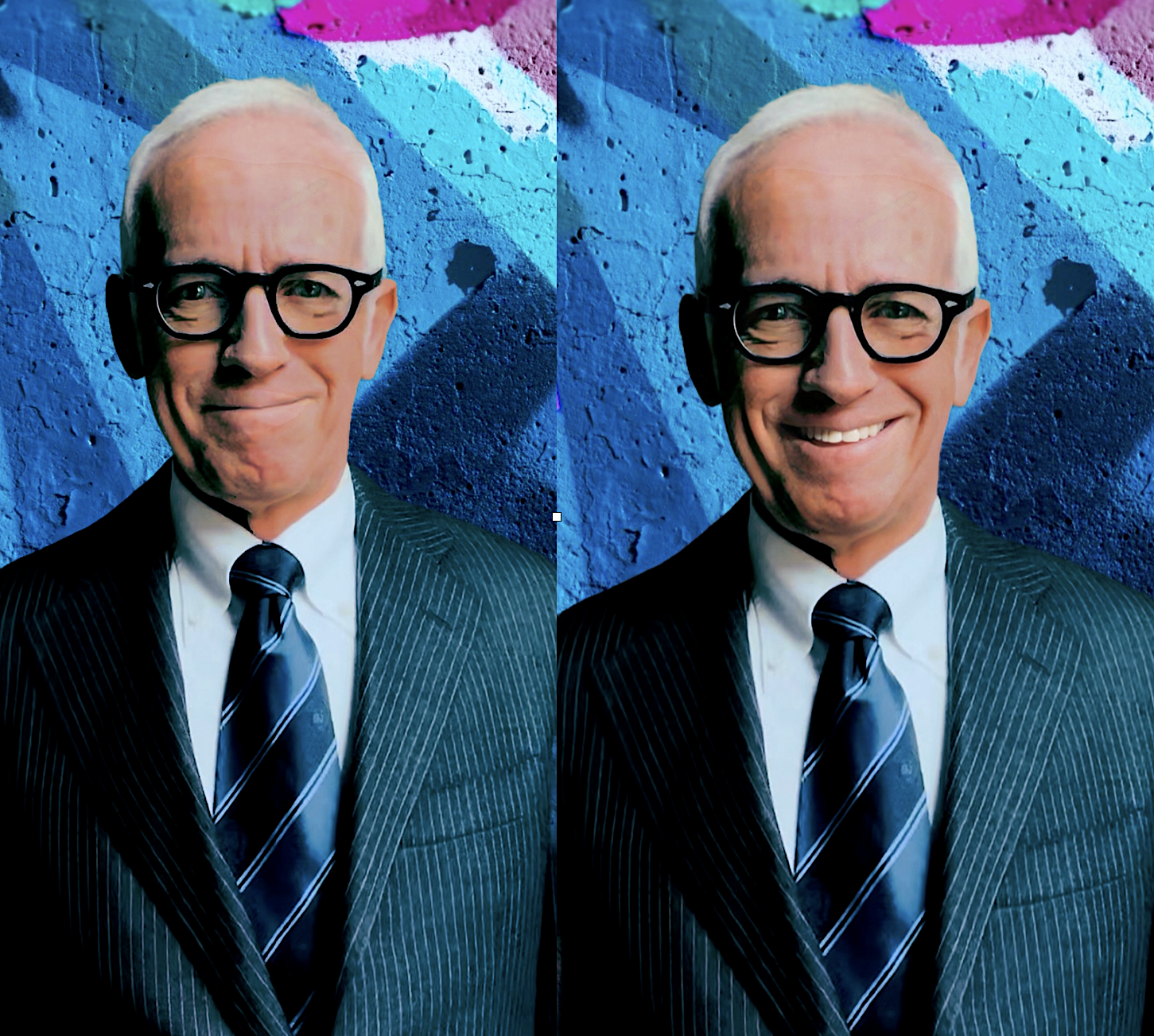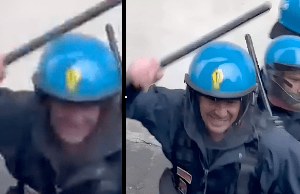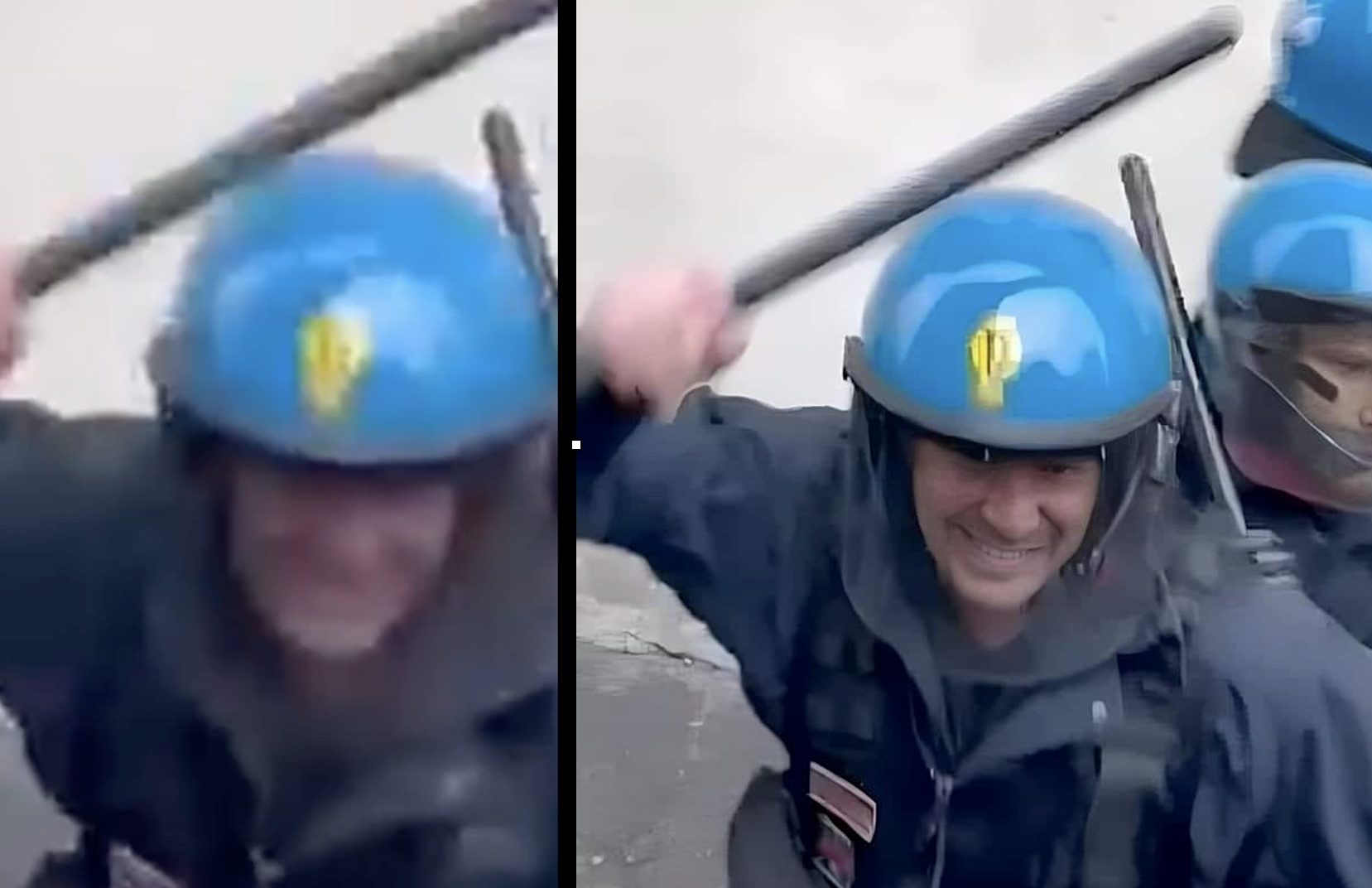 Come si vede dal raffronto delle due immagini (tratte da un video a bassa risoluzione) il viso del poliziotto a sinistra è contratto, la bocca è serrata ma non si distinguono le labbra, gli occhi nascosti dal casco nemmeno. Il volto dello stesso poliziotto a destra mostra un sorriso di scherno a piena bocca, i denti sono bianchissimi per evidenziare la cattiveria, gli occhi sono pupille nere dilatate. E’ evidente che la seconda foto è stata taroccata.