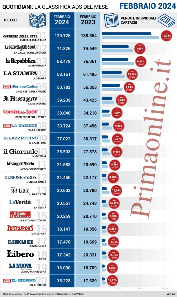 Il mese scorso è stato pessimo, ma questo (febbraio 2024 su febbraio 2023) lo è ancora di più. I quotidiani crollano di nuovo in edicola, con l’eccezione del Fatto Quotidiano, unico giornale in segno positivo. Lo dicono i dati elaborati da Ads e pubblicati qui da Prima Comunicazione.