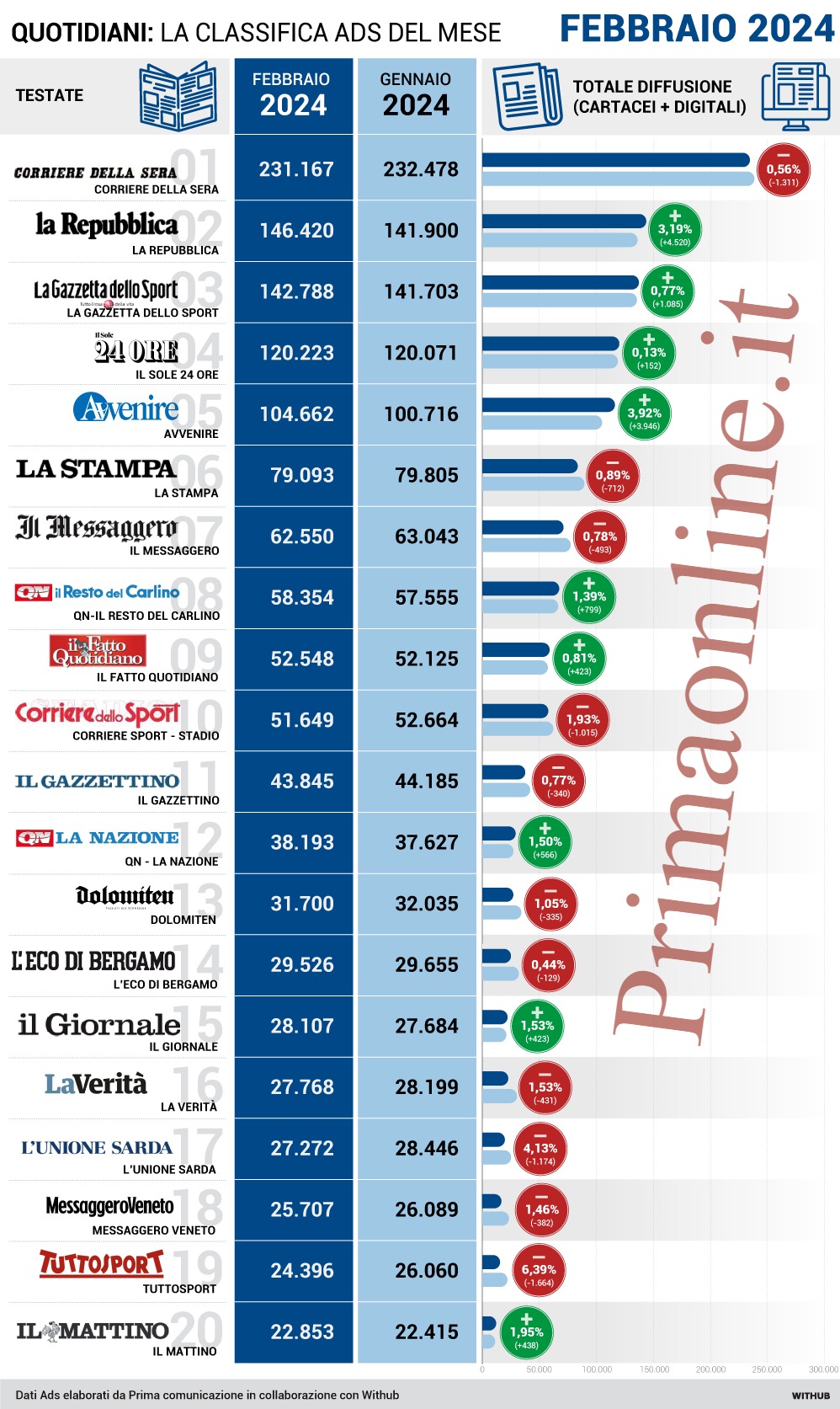 Il quotidiano su carta continua la sua corsa verso il basso. Tutti perdono copie massicciamente. La Repubblica con -9,97% non arriva a 70 mila copie, Il Corriere perde il 12,74% con vendita a poco più di 120 mila copie. Il ribasso più consistente è quello de La Stampa che registra un -13,66% (la seconda peggior performance della classifica, dopo La Verità) scende a 53.161 copie vendute in edicola e si avvicina a quella complicata soglia delle 50 mila, come già anticipavo il mese scorso.